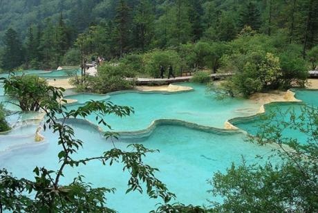主景区五彩池,游览后沿下山栈道,一路观看黄龙景点。返回黄龙景区大门口。