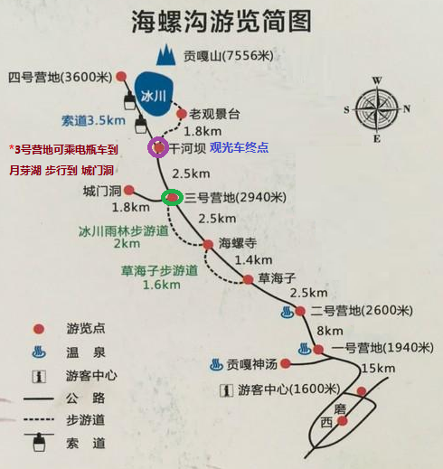 1.海螺沟景区公路全长34公里,其中主线起于磨西镇游客中心,共和村、一号营地、二号营地、草海子、海螺寺、三号营地,止于干河坝。一号营地以下15公里为沥青混凝土路面,一号营地以上19公路为三级水泥路面,全线危险路段为不锈钢防撞护栏和防撞墙,并设置交通警示标志标识。